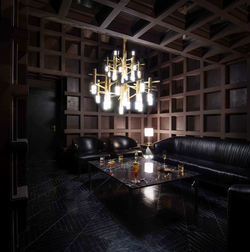 The coffered ceiling is repeated throughout the two private VIP rooms as coffered walls and ceilings where it conceals hidden doors to private powder rooms, AV equipment and private stock liquor cabinets. The coffers of the deep plum colored walls are inlaid with crocodile leather panels, together acting as a sound dampening device that ensures acoustic privacy to the VIPs and their guests. The private VIP rooms are accessed by a secret entrance in order to provide Yang Kun and his personal guests a genuine level of privacy away from the public eye.